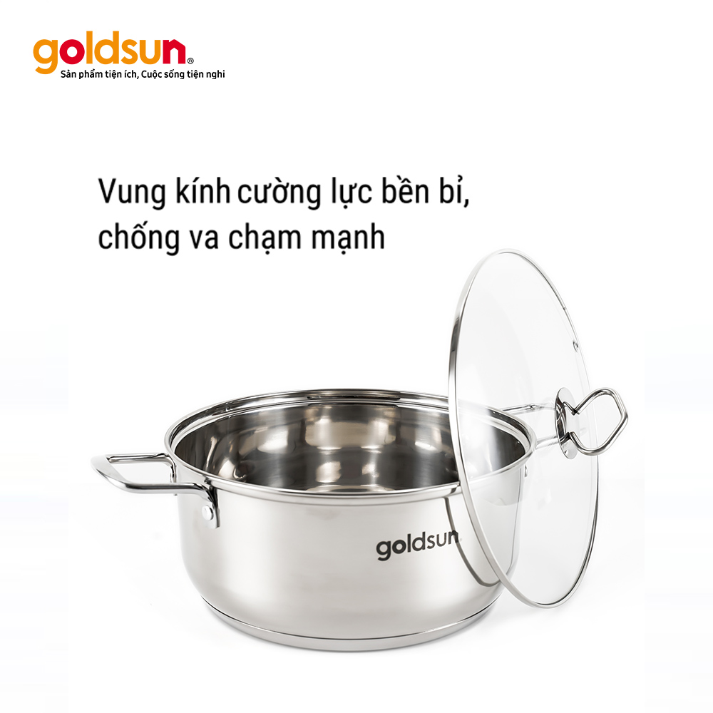 Nồi inox F24 được trang bị vung kính cường lực, trong suốt giúp bạn dễ dàng quan sát thực phẩm bên trong nồi. Viền mép vung được bọc inox, vừa sang trọng, vừa hạn chế bể vỡ khi va đập.